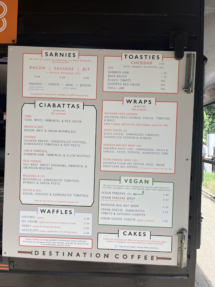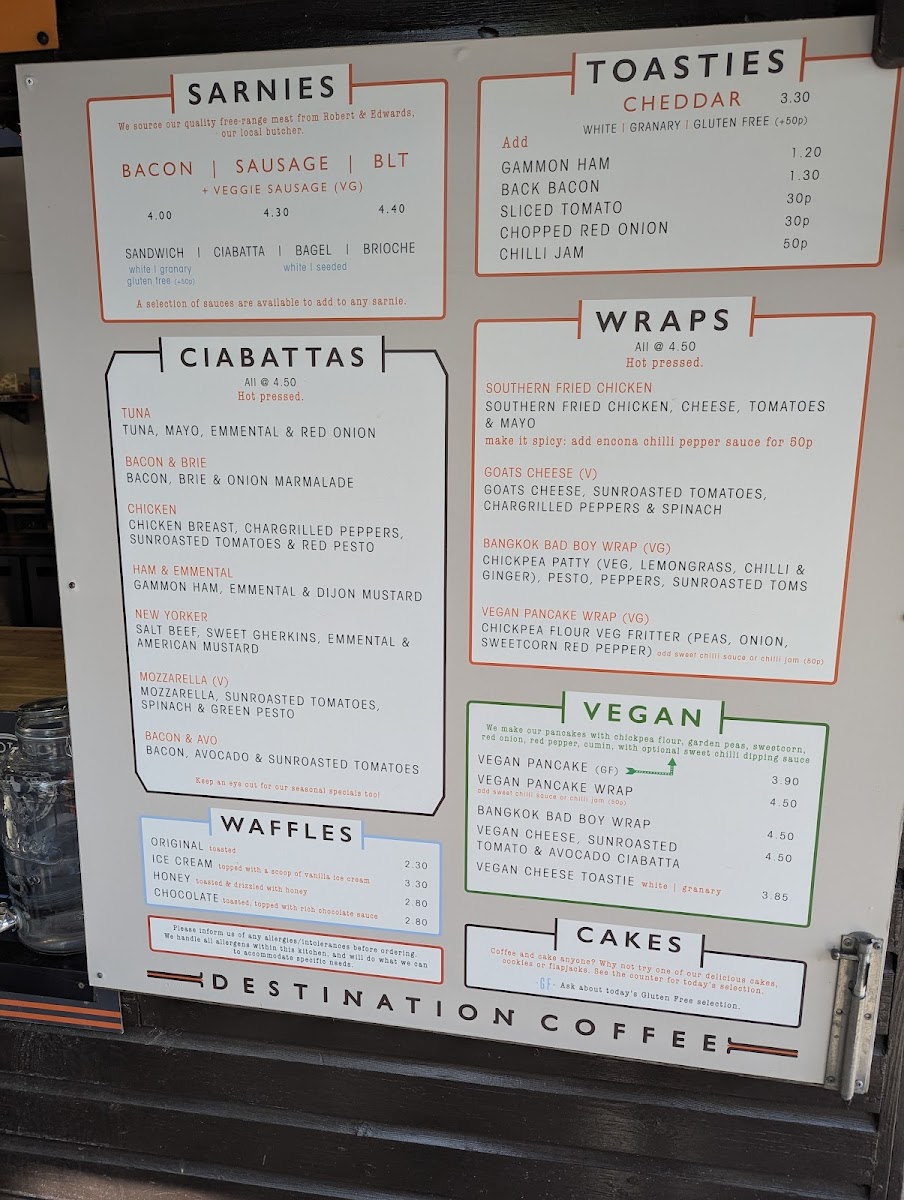 - Light meals and snacks including toasties with fresh ingredients, breakfast sarnies, and vegan-friendly wraps